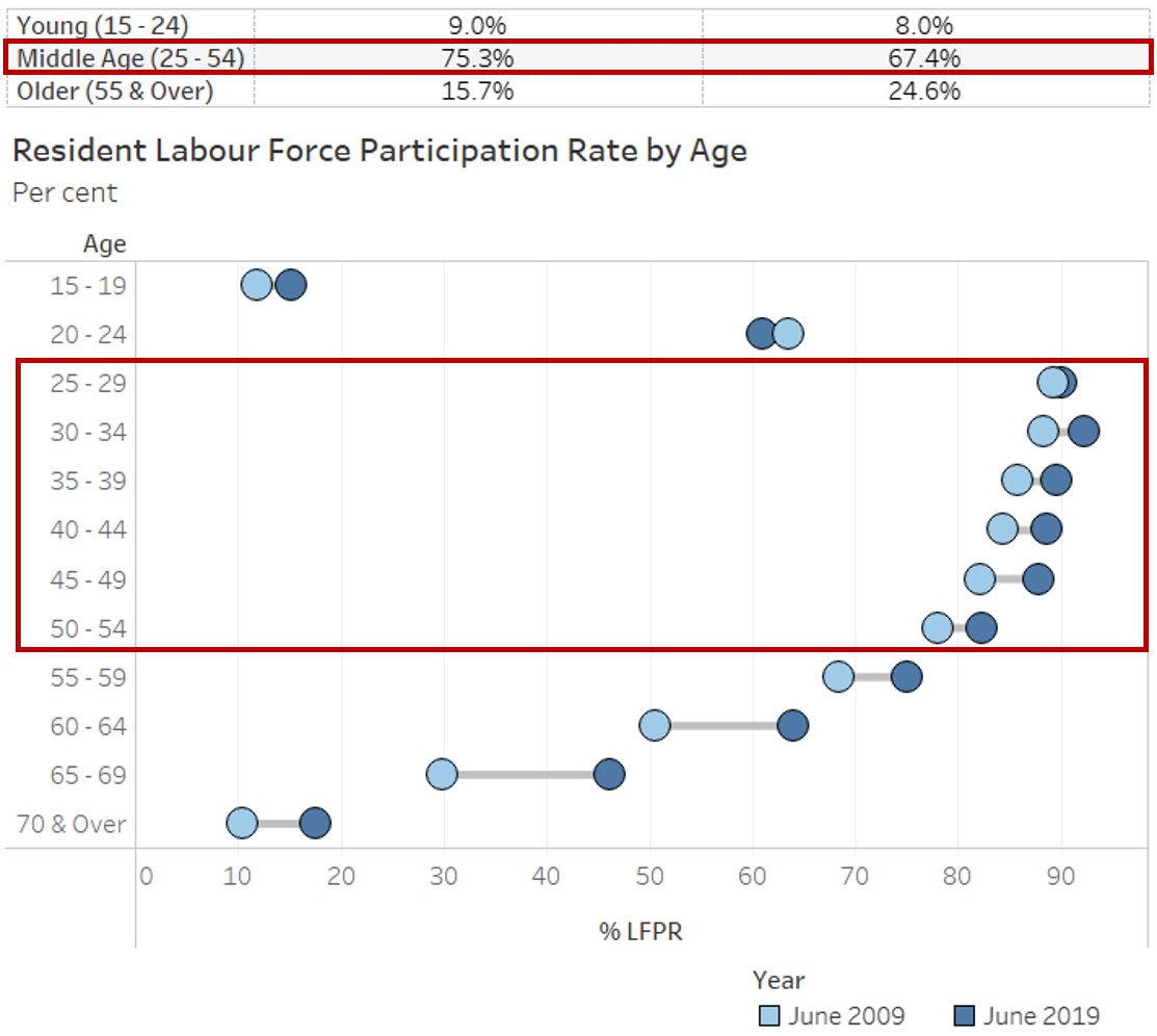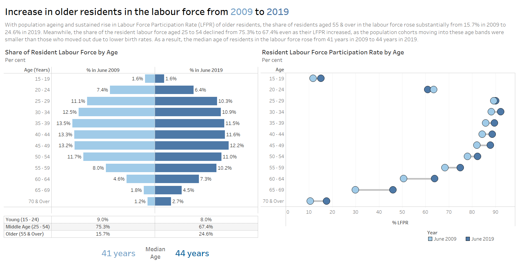 Between 2009 to 2019, share of the middle-aged residents (aged 25 - 54) among the resident labour force has declined (75.3% in 2009 to 67.4% in 2019), despite the increase in Labour Force Participation Rate (LFPR) among these middle-aged residents.