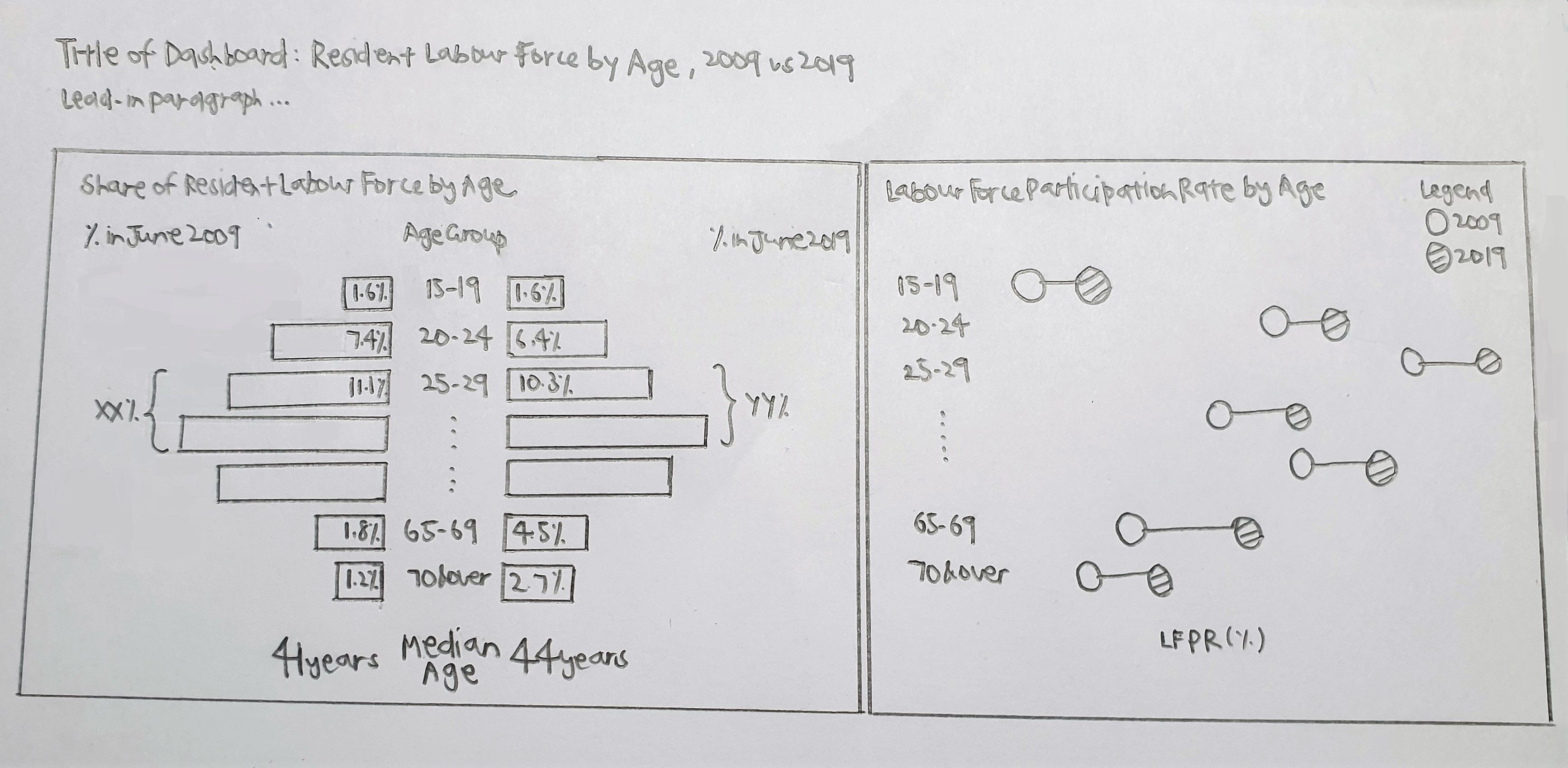 | 3 | Title of the existing chart might be confusing as “Resident labour force by age” might be interpreted as the actual number of residents that are in the labour force for each age band but the current unit for the chart is in percent. | Revise the chart title to “Share of Resident Labour Force by Age” to reflect that the figures shown are percentages and total across all age groups will sum to 100% |