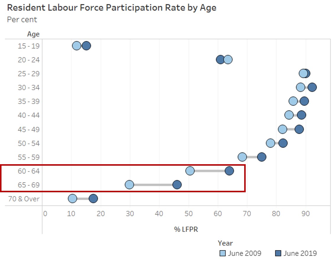 While LFPR remained lower among older residents (aged 55 & over) as compared to the middle-aged residents (aged 25 - 54) in 2019, there was a larger increase in LFPR observed among these older residents between 2009 to 2019, particularly among those aged 60 to 69 with more than 10% point increase.