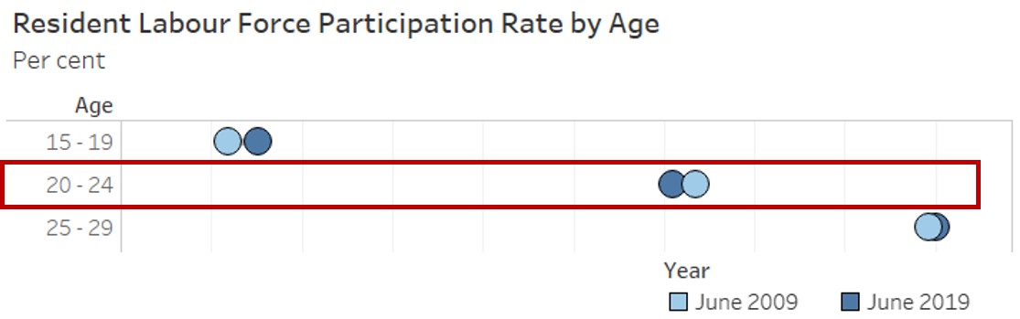 All age bands experienced a rise in the LFPR between 2009 to 2019, except for residents aged 20 to 24 where LFPR has declined from 63.5% to 61.0%.
