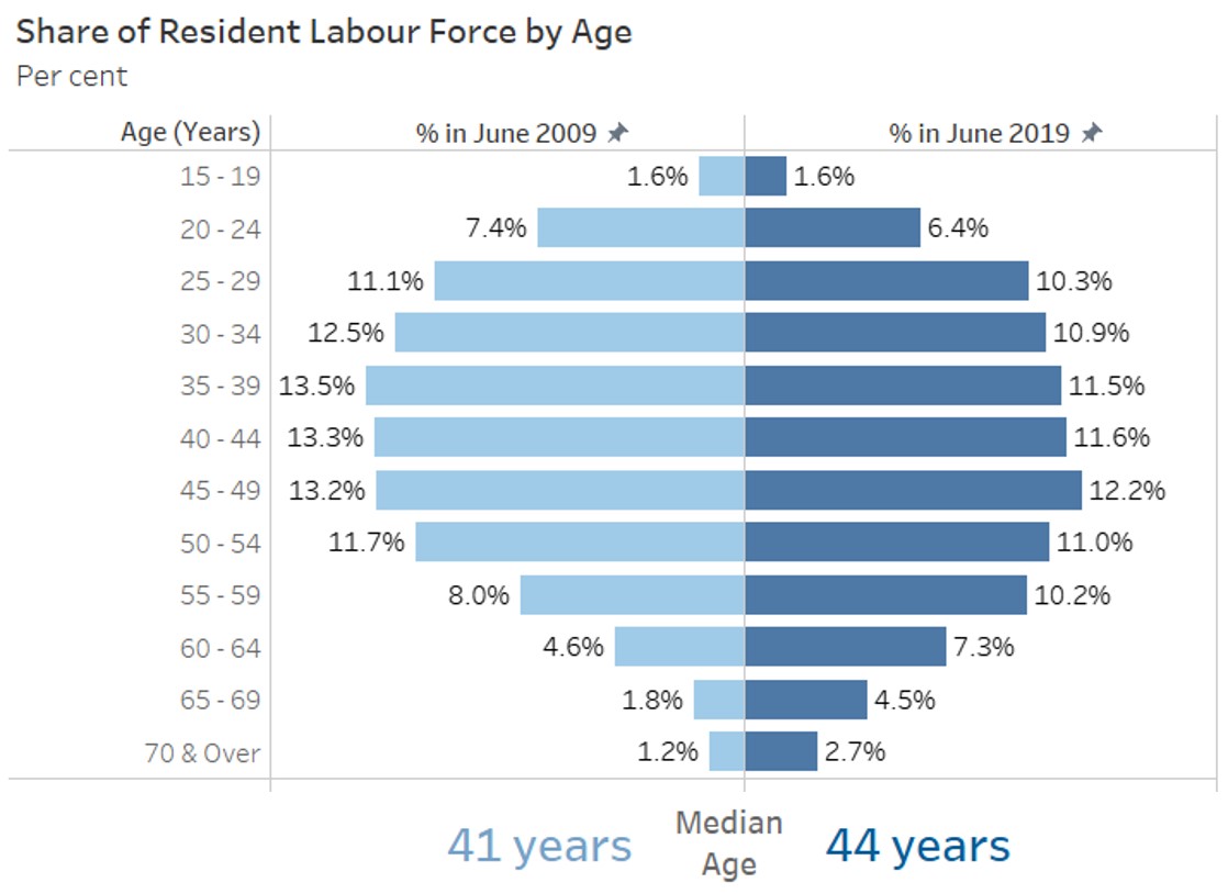 Distribution of the resident labour force used to be more right skewed in 2009 (i.e. younger labour force) as compared to 2019, where the distribution of the resident labour force appears to be more symmetric. This is further supported by the increase in median age of the residents in the labour force.