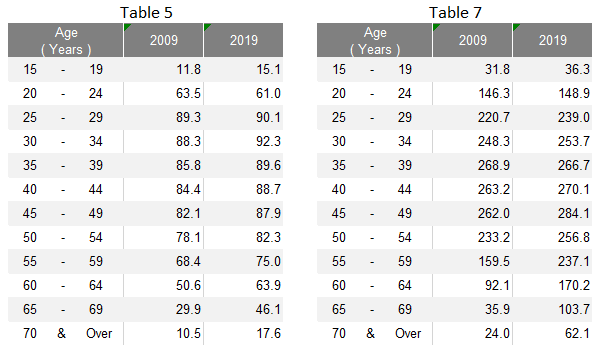 | 1 | Excel Tables | Data preparation - Extract relevant data and format into proper structure | Perform the following steps for Table 5 and Table 7: • Extract data from the Total tab, keeping only column data for 2009 and 2019 as well as row data for the header and the individual age bands (i.e. rows 5, 7 to 18) • Format the structure to remove all the leading empty rows (i.e. header to start at row 1) and all the empty columns so that the data is in the correct format for importing into Tableau Save the extracted data into a new excel file with one table on each worksheet tab |