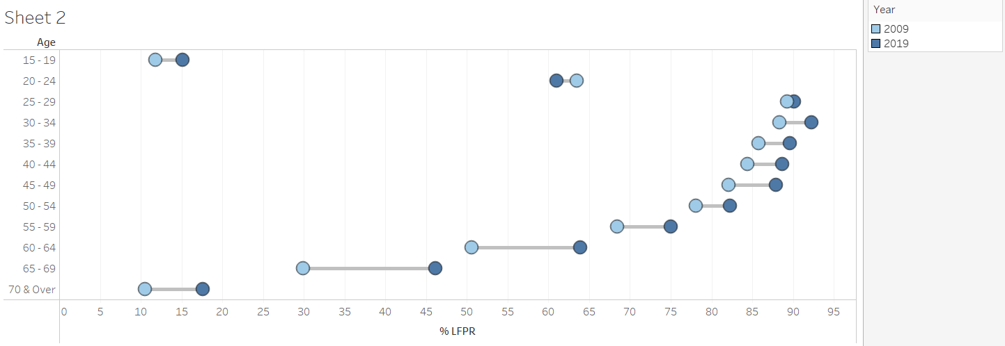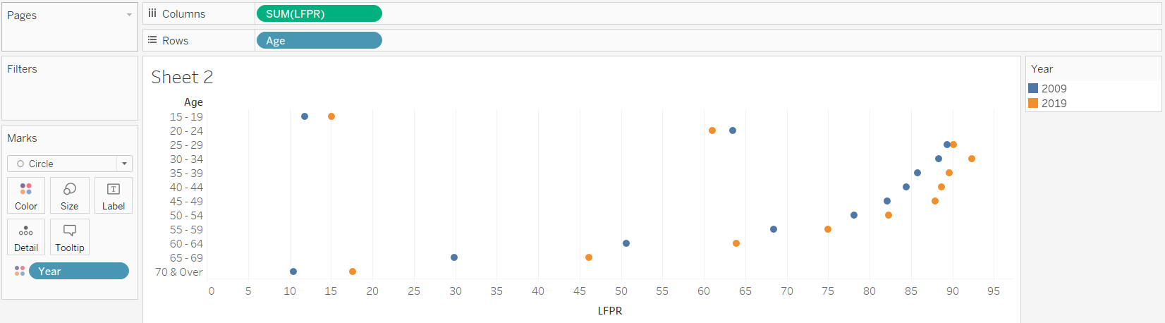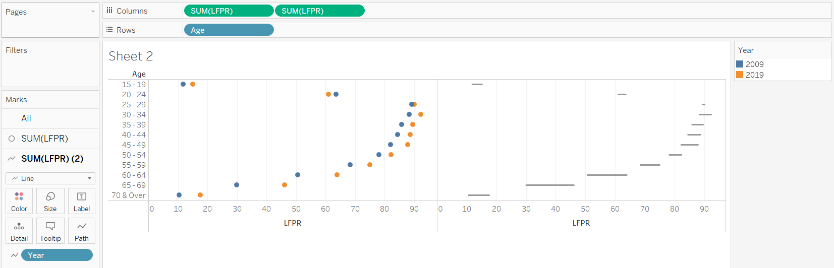 | 10 | Sheet 2 (LFPR) | Create dumbbell chart for LFPR by Age | • Drag T5 Age under Rows, LFPR under Columns and Year under Colour • Change the mark type from Automatic to Circle • Drag another LFPR under Columns and change the mark type to Line • Remove Year from Colour and drag it to Path ![]() |