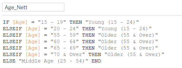 | 13 | Sheet 3 (LF_Nett) | Create new calculated field with recoded age bands | Recode the age into broader age bands using “Create Calculated Fields…” and input the details below ![]() |
