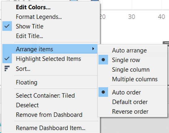 | 17 | Dashboard | Format the Legend | • Rearrange the legend to display it under the LFPR chart • Right click on each legend and click “Edit Alias” to rename each legend label to “June [YYYY]” • Click more options on the left of the Legend, select “Arrange items” and Single Row • Add a Blank to the left of the Legend to right align the Legend relative to the LFPR chart |