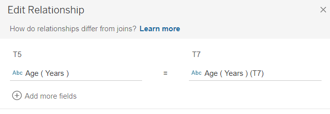 | 3 | Data Source | Import data into Tableau | • Under Connect to a File, click Microsoft Excel and select the relevant excel file from the correct directory • Relate Table 5 and Table 7 using the common variable of Age (Years) ![]() |