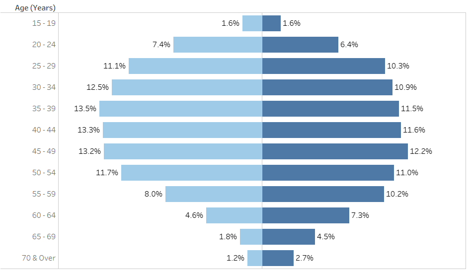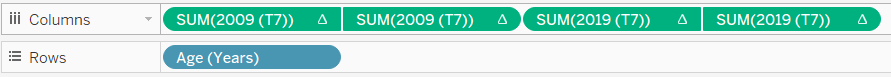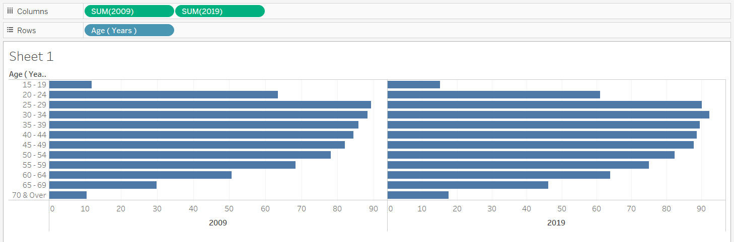 | 4 | Sheet 1 (LF_Share) | Create pyramid chart for Share of Resident Labour Force by Age | Drag T7 Age under Rows, T7 2009 and T7 2019 under Columns ![]() |