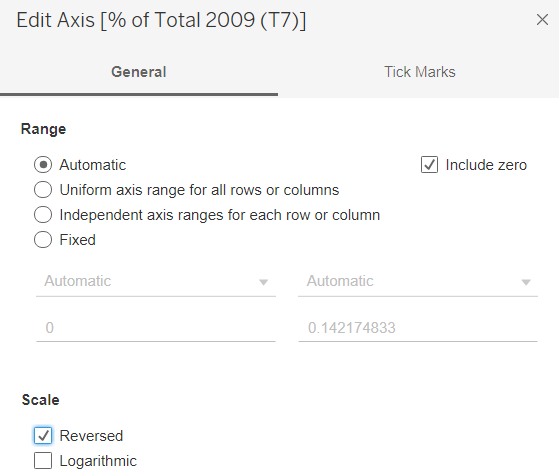 | 6 | Sheet 1 (LF_Share) | Format the charts | • Edit the x-axis of the 2009 chart and select “Reversed” to reverse the axis of the chart on the left • Click on Label and select “Show marks labels” to add the chart labels for both 2009 and 2019 charts • Format the measures to display them to 1 decimal place by changing the “Numbers” under Default section of the Pane tab to Percentages 1 decimal place • Right click on the x-axis and select Edit Axis. Fix the range to have a consistent range for both left and right charts • Colour code the 2 charts into 2 different colours by year using the Colour button under the Marks cart • Remove the vertical gridlines under Format Lines by changing the “Grid Lines” of the Column tab to None • Edit the Tooltip under the Marks cart for the label of the % to “% out of Total in [YYYY]” ![]() |