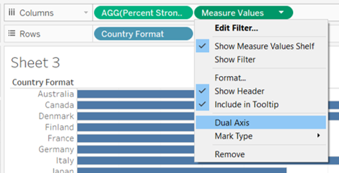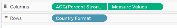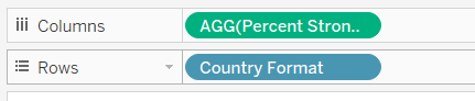 - From the left Data pane, drag [Country Format] to Rows and [Percentage Strongly Agree] under Columns