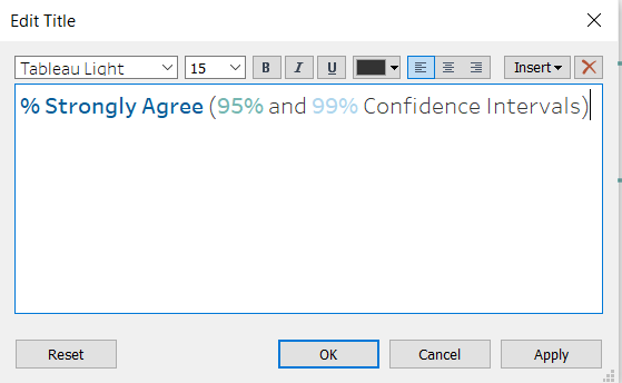 - Double click on the sheet title and amend it to “% Strongly Agree (95% and 99% Confidence Intervals)”. Click OK