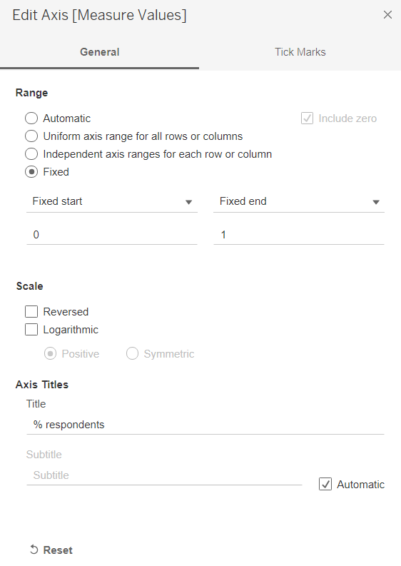 - Right click on the bottom x-axis and select Edit Axis. In the popup “Edit Axis” window, change the Axis Title to “% respondents” and select Range as Fixed and change the range as 0 to 1. Close the window