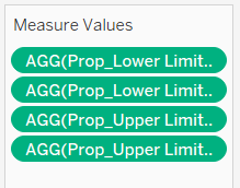 - Drag [Measure Values] to Columns. Remove the unwanted measures and keep only Prop_Lower Limit 95%, Prop_Lower Limit 99%, Prop_Upper Limit 95% and Prop_Upper Limit 99%