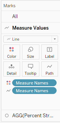- In the Measure Value Marks cart, remove [Measure Names] from Detail. Drag [Measure Names] from the left Data pane to Path and another to Color