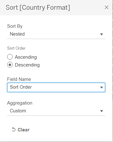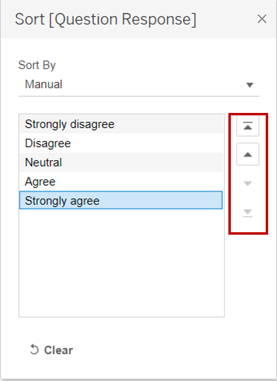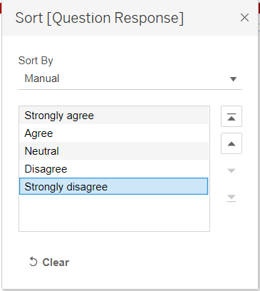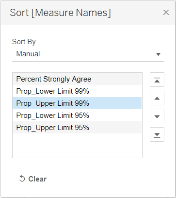 - Click on the dropdown button at the top right of the Measure Names Legend. Select Sort. In the popup “Sort” window, select Manual under Sort By. Sort the labels using the arrows at the right into the order below. Close the window