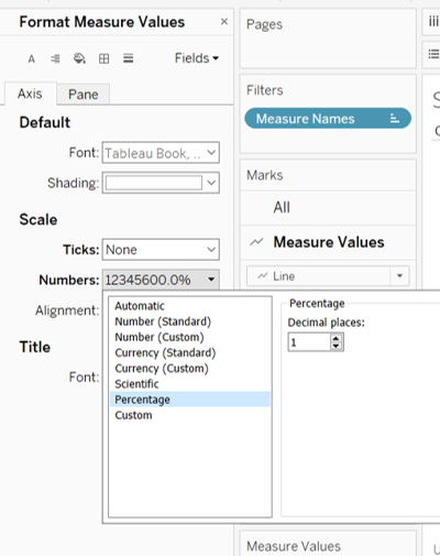 - Right click on the bottom x-axis and select Format. Under Axis tab, change the Numbers under Scale section to Percentage with 1 decimal place and Ticks to None