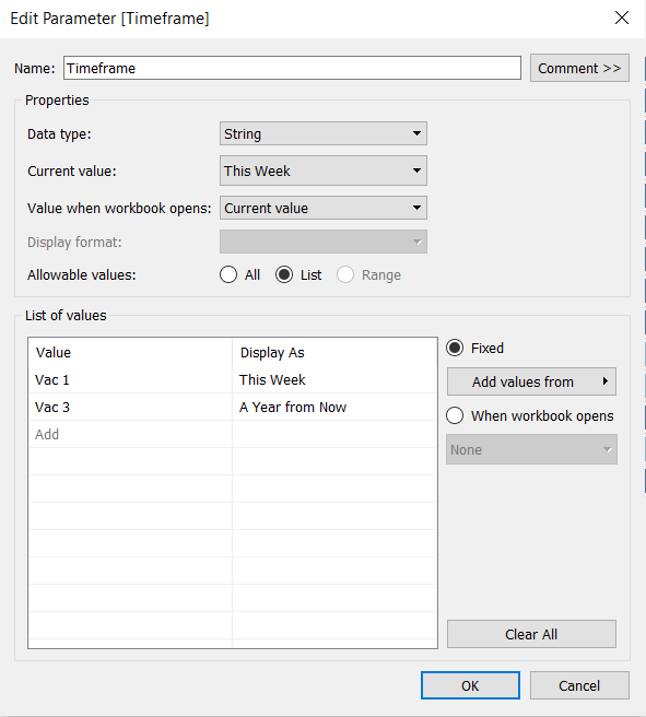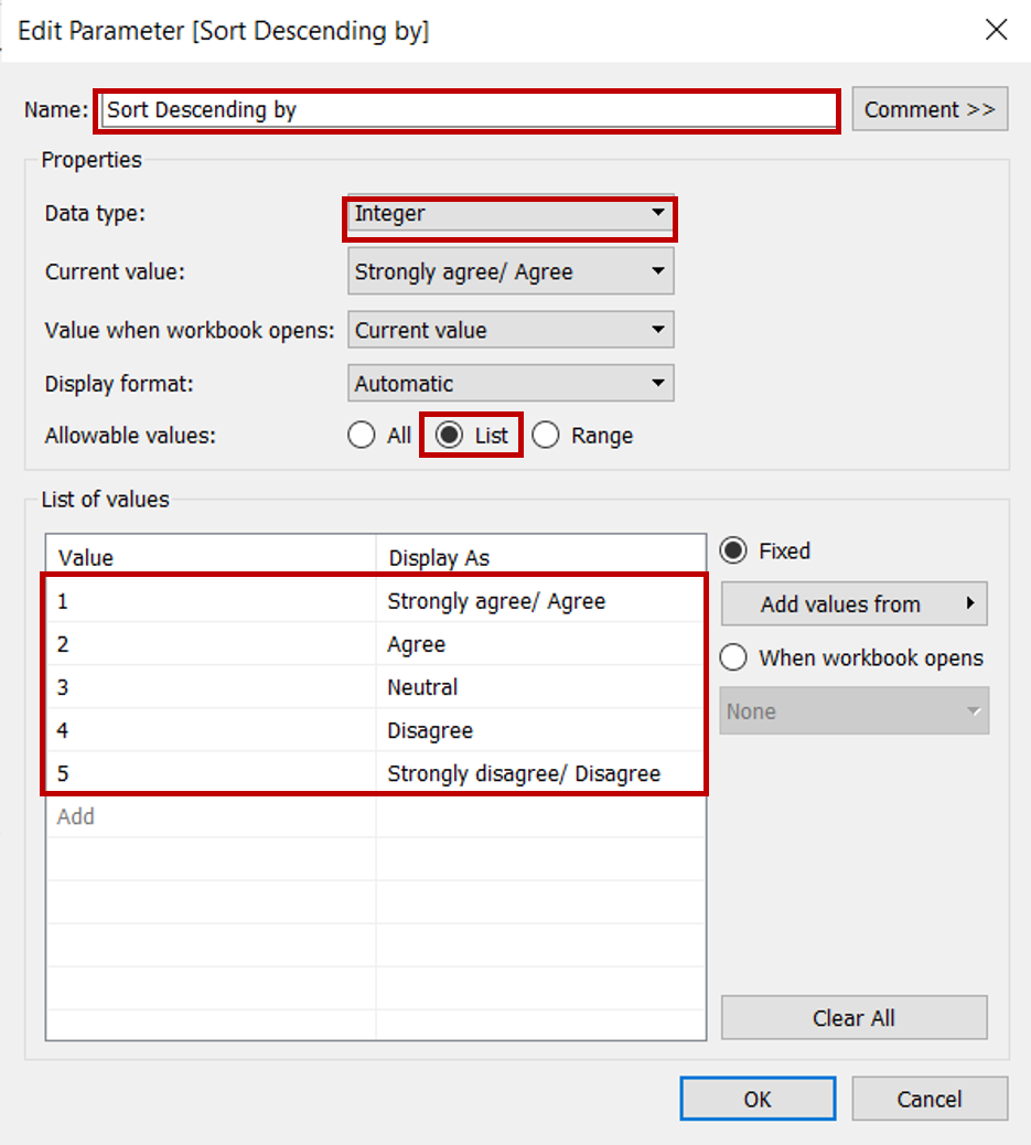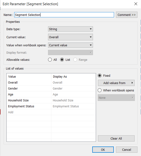 In the popup “Create Parameter” window, rename the parameter as “Segment Selection”. Select String under the Data type and select List under Allowable values. Under the List of values, input the list of contextual fields as below. Click OK