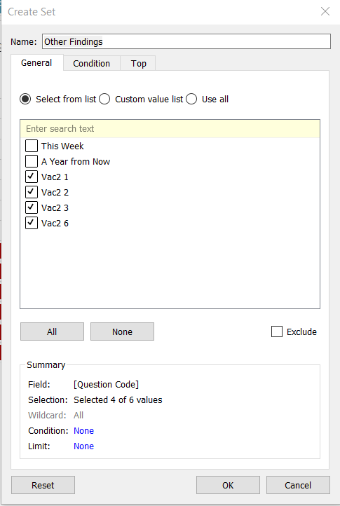 - In the popup “Create Set” window, check all options that should appear in the final filter card (i.e. Vac 2_1, Vac 2_2, Vac 2_3 and Vac 2_6). Rename the Set as Other Findings. Click OK