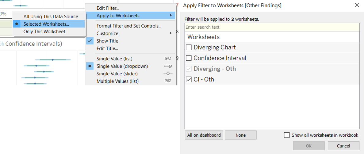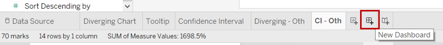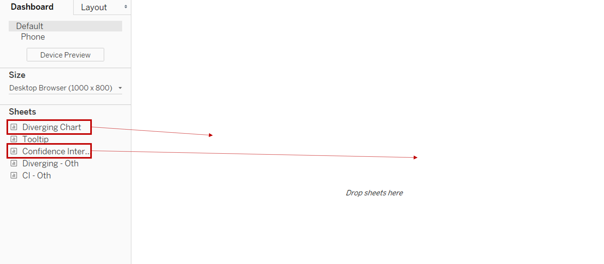 - Drag [Diverging - Oth] under Sheets onto the dashboard sheet below the [Diverging Chart]. Drag [CI - Oth] below the [Confidence Interval] chart
