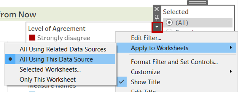 - Click on the dropdown arrow on the left and select Apply to Worksheets > All Using This Data Source