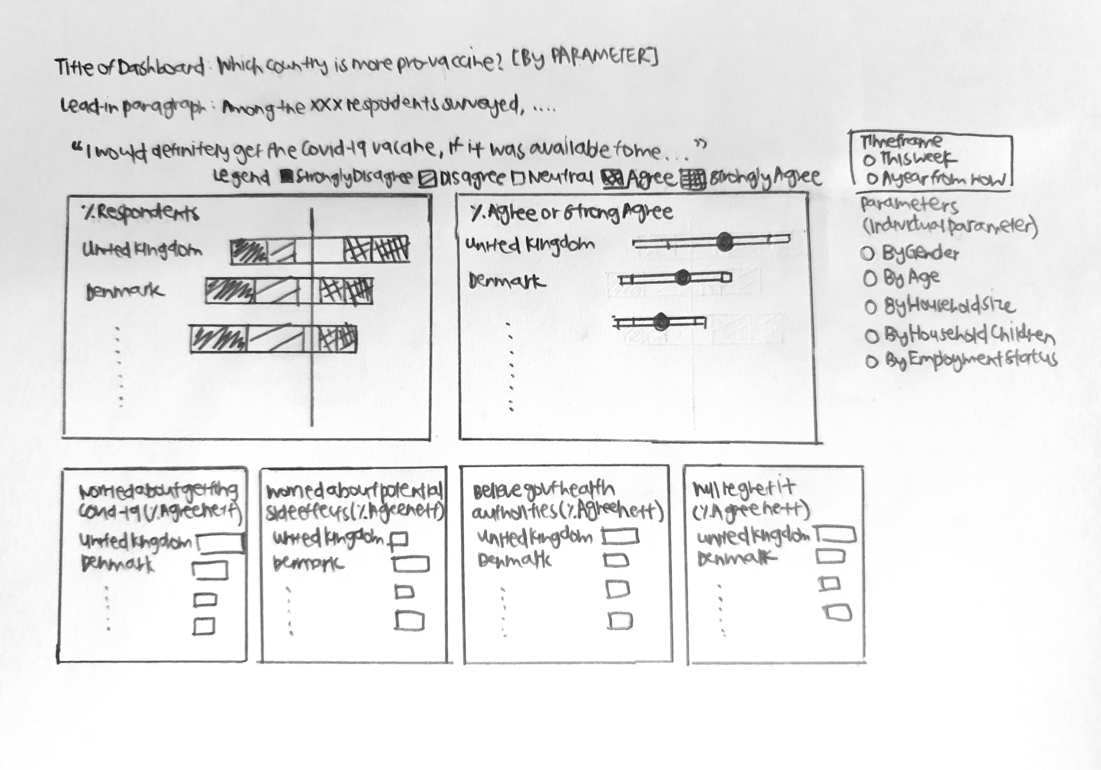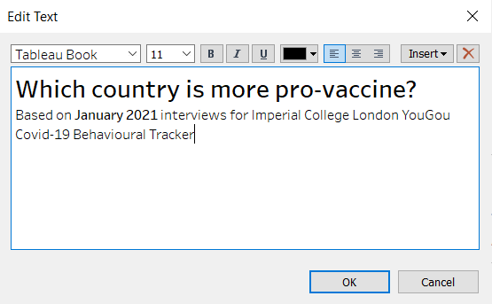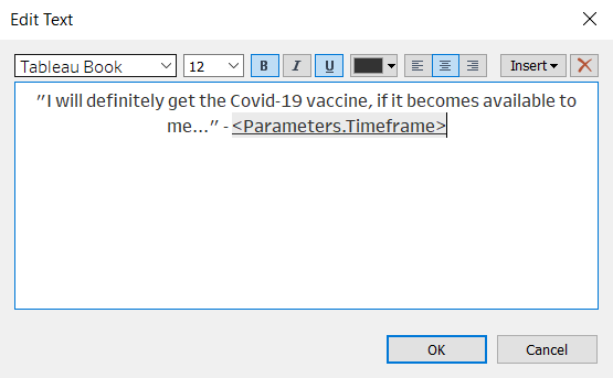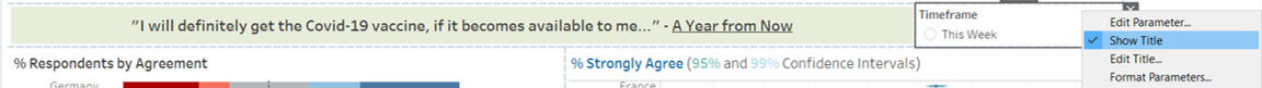 - Select the Timeframe Parameter and drag it to beside the “I will definitely get the Covid-19 vaccine…” text. Right click within the parameter and unselect Show Title