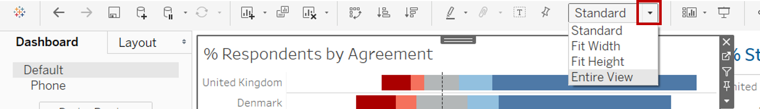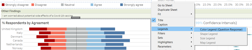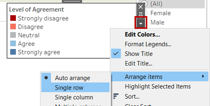 - Select the Level of Agreement Legend and drag it to under the first row stacked bar chart. Click on the dropdown arrow on the right and unselect Show Title. Click on the dropdown arrow again and select Arrange items > Single row