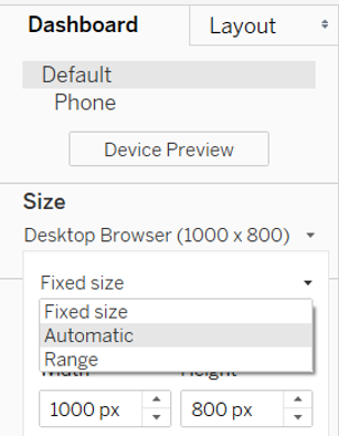 - In the left Dashboard pane, under Size, change it to Automatic
