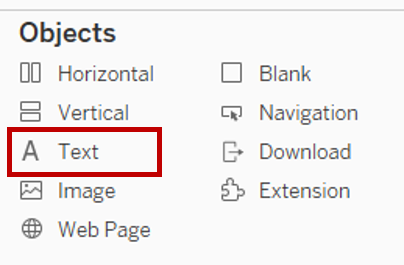 - From the left Dashboard pane, drag Text under Objects to the top of the dashboard to add the dashboard title and lead in paragraph