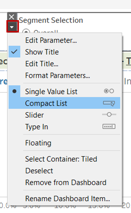 - Select the Segment Selection Parameter and drag it to the top beside the dashboard title as a new column. Click on the dropdown arrow on the left and select Compact List