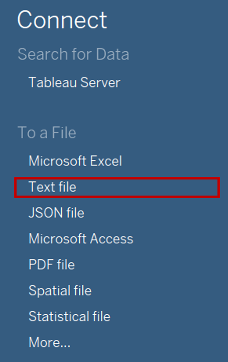 - Launch Tableau. Under Connect to a File, click Text File