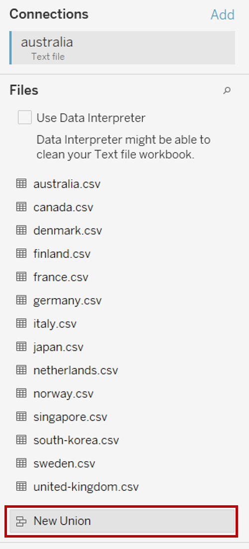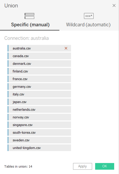- In the popup “Union” window, drag in the datasets for all 14 countries from the left pane and click OK to merge rows from all datasets into one
