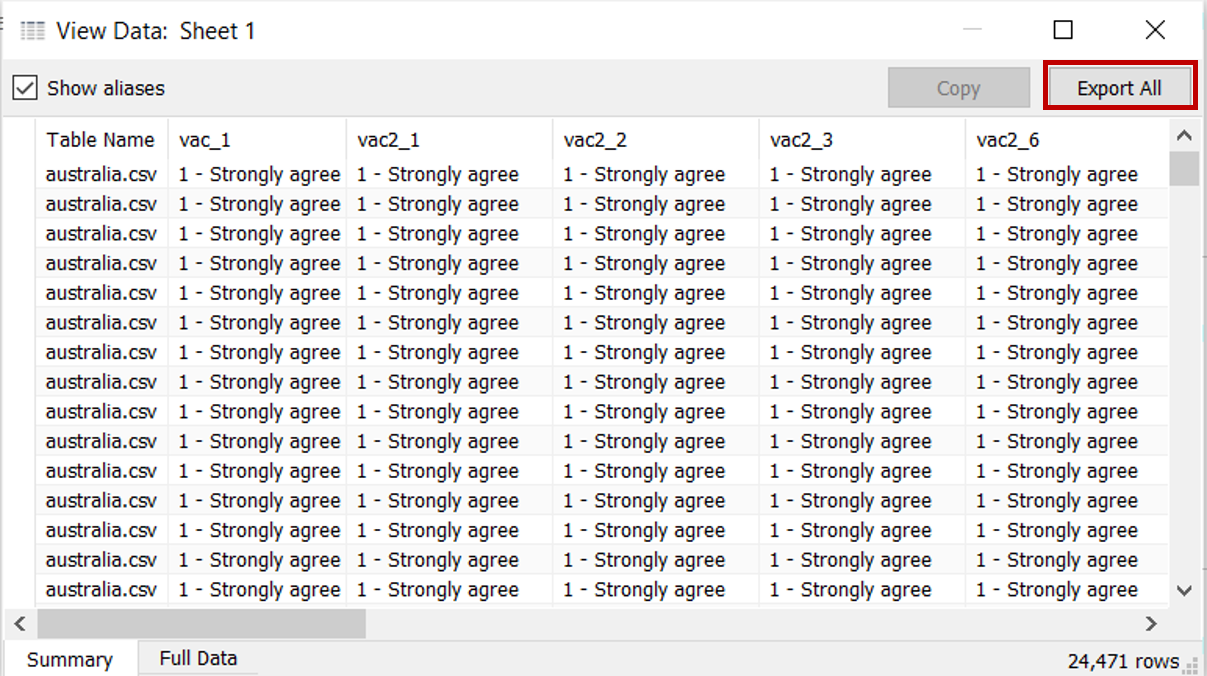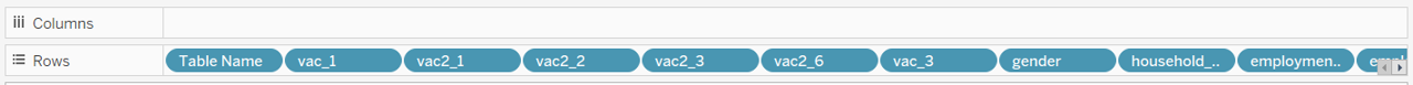 Drag the dimensions and measures for all the data fields of interest (Vac 1, Vac2_1, Vac2_2, Vac2_3, Vac2_6, Vac_3, Gender, Age, Household Size, Household Children, Employment Status) as well as country (i.e. Table Name) under the rows. For employment status, include all the relevant dimensions i.e. Employment Status, Employment Status 1, Employment Status 2 etc.