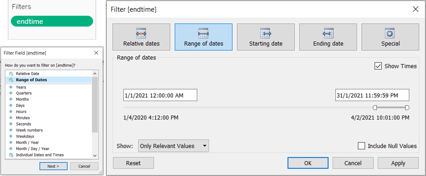 Drag endtime under Filters cart and select range of dates, then indicate 1 Jan 2021 12AM as the start date and 31 Jan 2021 11.59PM as the end date to only keep data in Jan 2021