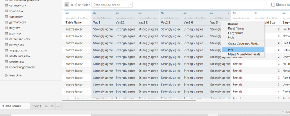 On Data Source tab, select the columns of the 6 data fields (Vac 1, Vac2_1, Vac2_2, Vac2_3, Vac2_6, Vac_3). Toggle to the top right of one of the selected column and click on the dropdown button. Select Pivot