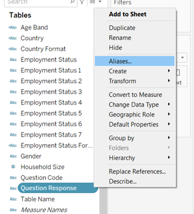 - Toggle to the pill of [Question Code] under the left Data pane and click on the dropdown button to the right of the pill. Select Aliases