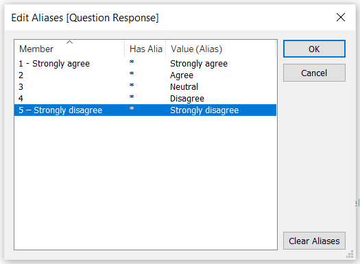 Type the textual labels for the options under the “Value (Alias)” column and click OK. This helps to add proper text labels to the fields for display in the visulisation