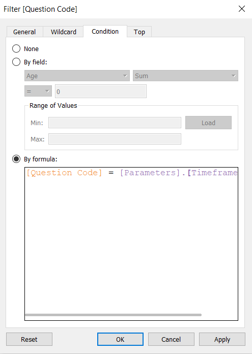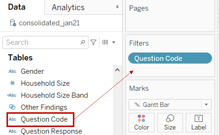 - From the left Data pane, drag [Question Code] to Filters cart