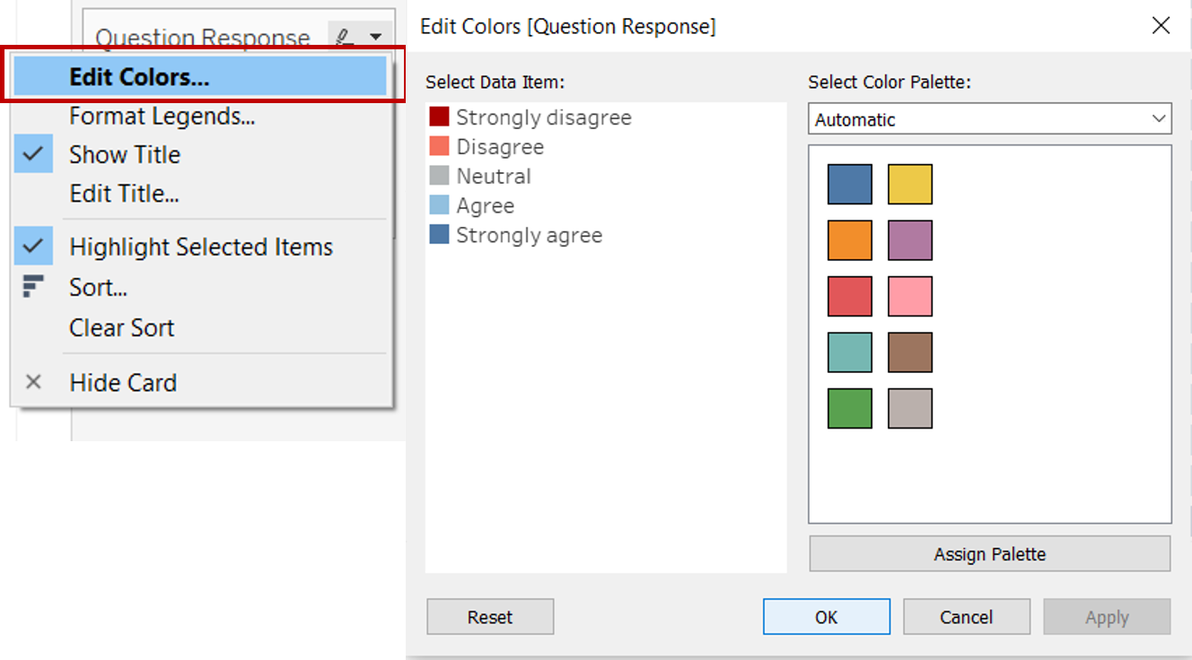 - Click on the dropdown button at the top right of the Measure Names Legend. Select Edit Colors. Change the colours of each category. The following colours were used for this dashboard: