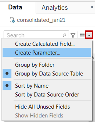 In the left Data pane, click the dropdown button at the top right corner and select Create Parameter