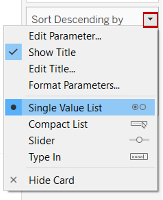 - Select the Sort Descending by Parameter and drag it to the same column under the Segment Filter. Click on the dropdown arrow on the left and select Compact List