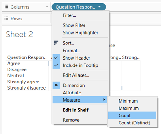 - Reorganise the order of the dimensions under Columns to show the [Measure Values] before [Percent Strongly Agree]