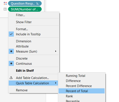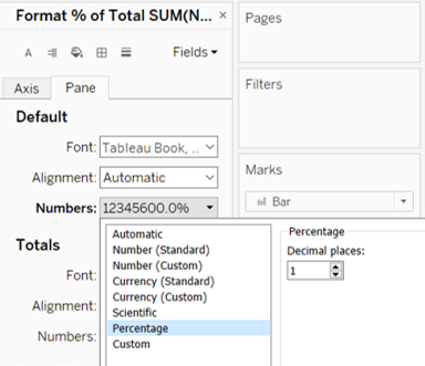 - Toggle to [AGG(Percent Strongly Agree)] under Columns and click on the dropdown button to the right of the pill. Select Format. Under Pane tab, change the Numbers under Scale section to Percentage with 1 decimal place