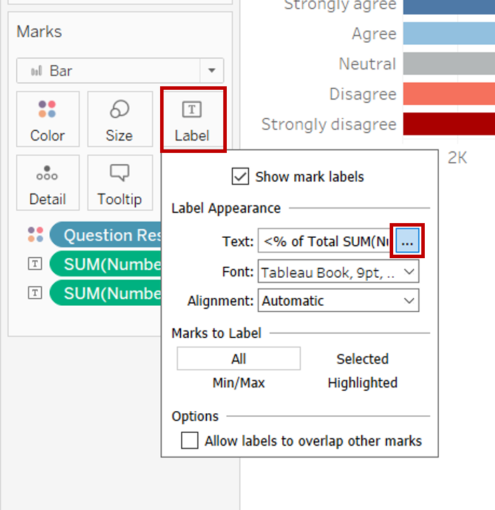 - Click on the AGG(Percent Strongly Agree) Marks cart and change the Marks type to Circle. Click on colour to change it to the same colour as the Strongly Agree bar in the diverging stacked bar chart. Adjust the size of the dot to reduce it