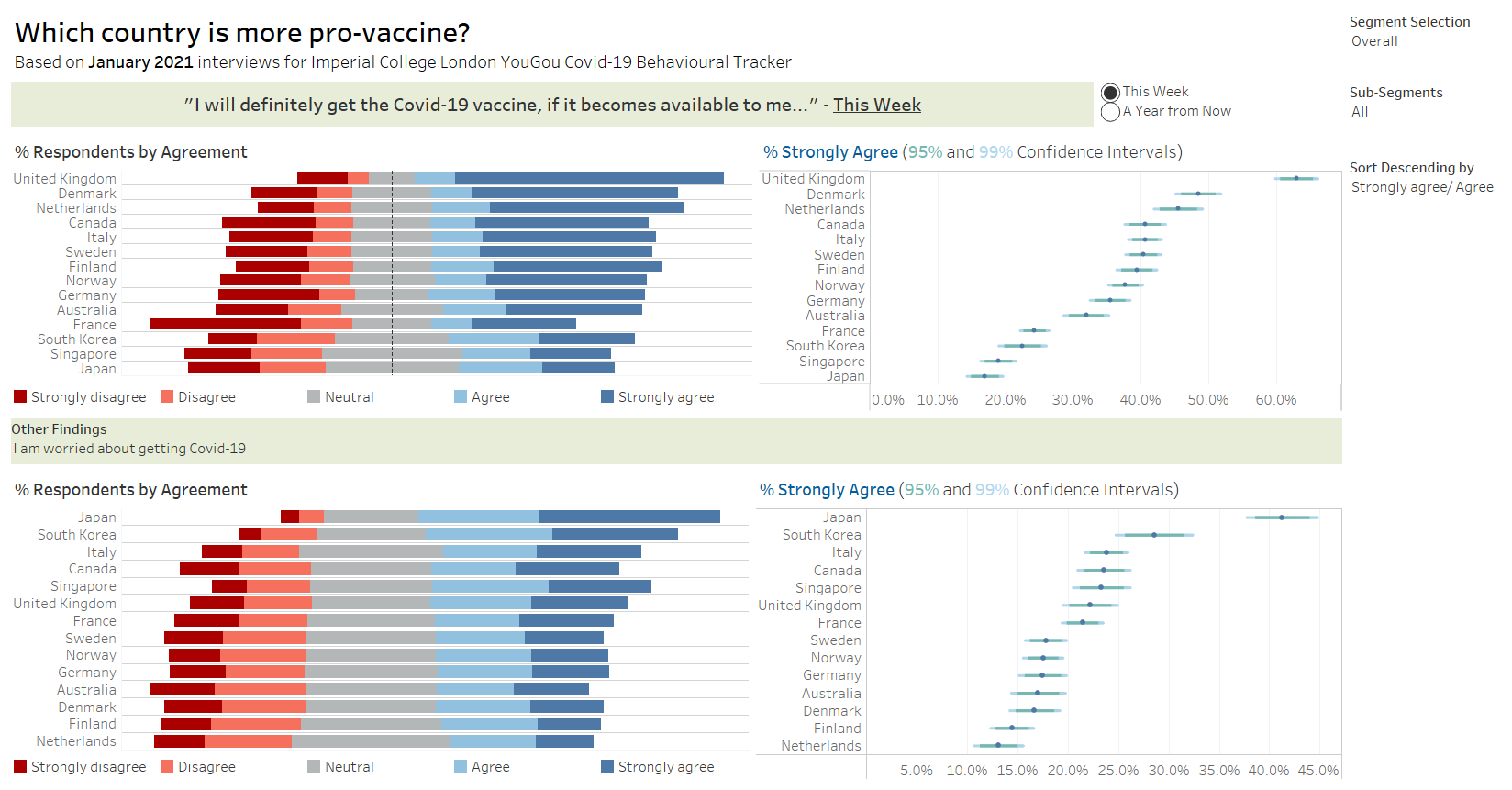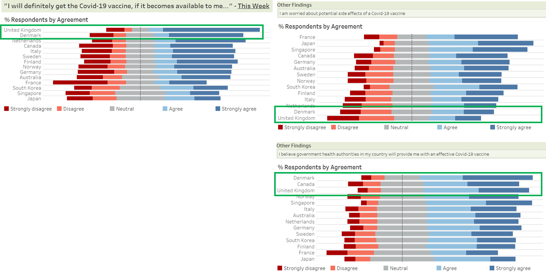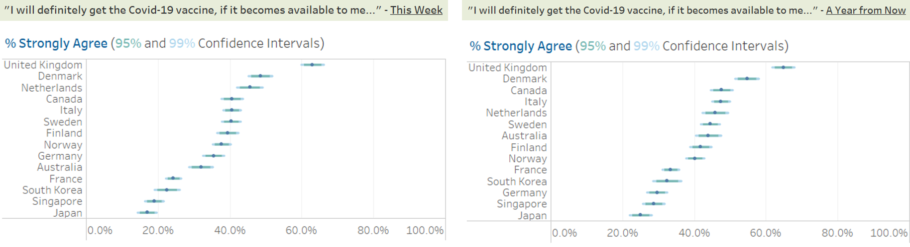 The order of the countries on the y-axis for both charts are not synchronised, making it difficult for the readers to match the corresponding country bars between the two charts. However, the use of sorting for the chart “% of strongly agreed to vaccination” makes it easier for readers to view the relative results across the countries. |