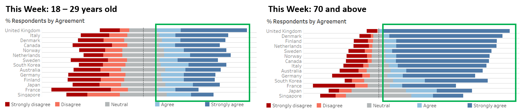 - Bar charts are kept to show the proportions of respondents within each country that have selected each of the response option. To further improve the ease of comparison, stacked bar charts are adopted that aligns the disagree vs agree.