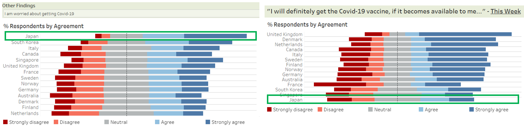 While Japan has the highest proportion of respondents who indicated that they are worried about getting Covid-19 among the 14 countries, it has the lowest proportion of respondents who agreed they they get the Covid-19 vaccination if made available to them this week or even a year from now.