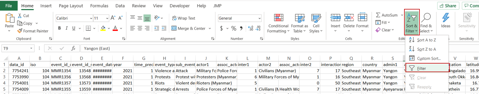 Filtering Relevant Data from ACLED Dataset [Excel Worksheet]