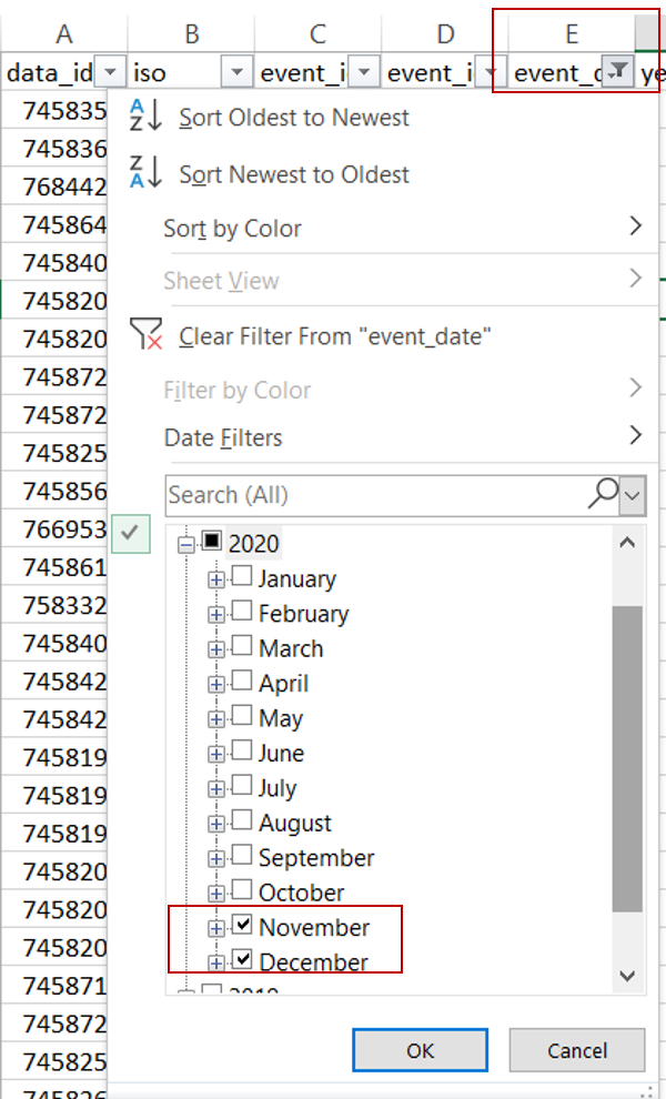 - Under Column E [event_date], click on the dropdown button. Uncheck (Select All) and scroll down to select only 2020 > November and December. Months can be seen by clicking on the (+) button to the left of the year