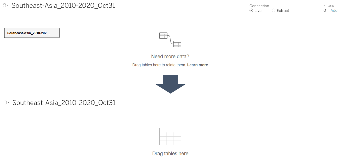 - Navigate to the file directory where the csv datasets are saved and double click on the “Southeast-Asia_2010-2020_Oct31” file