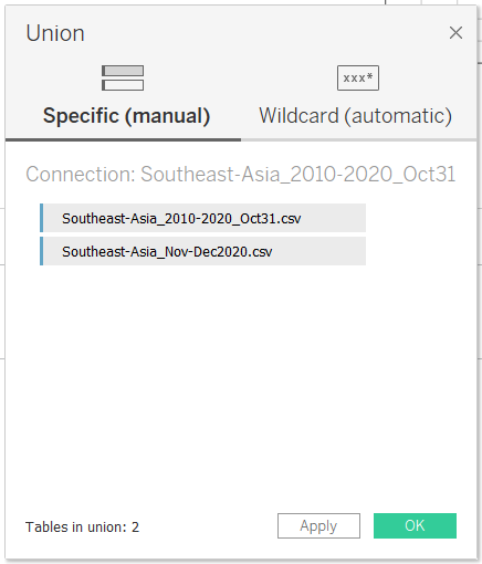 - In the popup “Union” dialog box, drag in the 2 datasets of Southeast-Asia_2010-2020_Oct31 and Southeast-Asia_Nov-Dec2020 and click Apply. This step will concatenate the two datasets into 1 master dataset