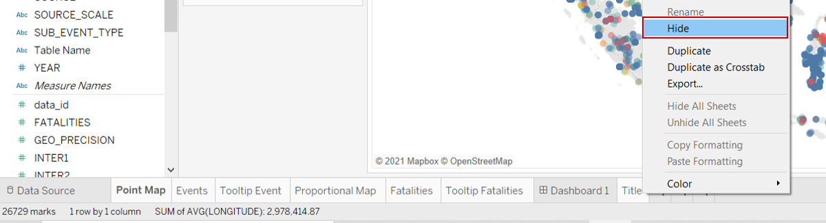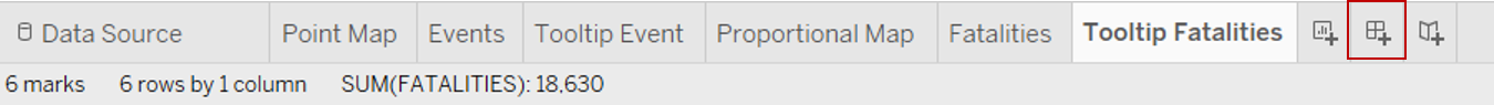 - Right click on the Sheet 6 tab on the bottom bar and select Rename. Rename the sheet to “Tooltip Fatalities”